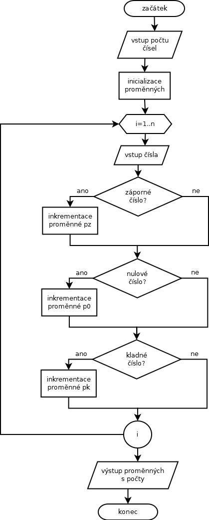 pomocí cyklu FOR načteme všechna čísla a každé z nich zkontrolujeme, zda je jeho hodnota kladná, nulová nebo záporná.