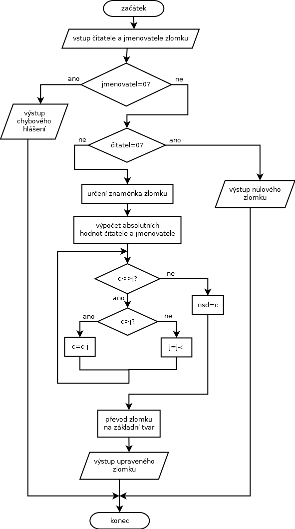 Pokud ji obsahuje, vytiskneme hlášení o nulovém zlomku. Pokud ani jedna zadaná hodnota není nulová, zjistíme