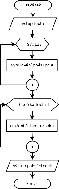 pole četností jednotlivých znaků (pole četností má indexy v intervalu 97..122 = pořadí malých písmen anglické